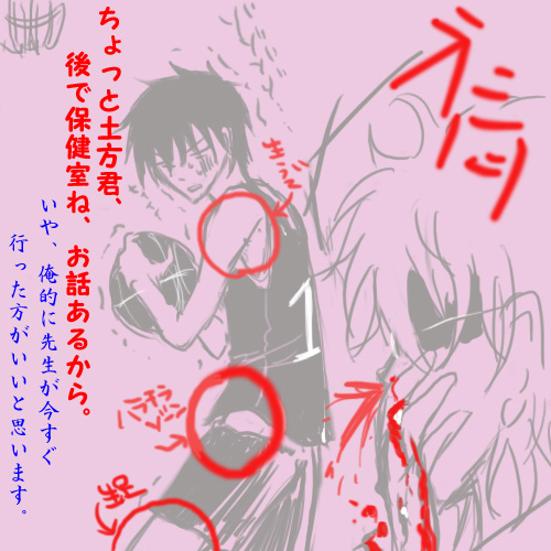 いっそのことハラチラ(わき腹チラみせ)して先生に鼻血吹かせればイイんだ。んで、そんな土方を見せたくないとばかりに保健室に引きずり込もうとすればいい。んでもって、右手ストレート食らってればイイです。応援する先生の左頬が赤いシーンが私には見えました(幻想じゃないよ妄想だよ