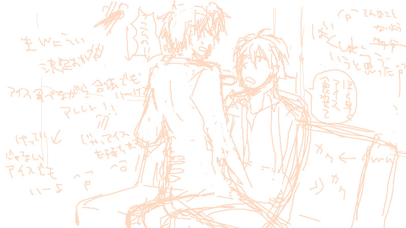 右に丁度この左の二つが書かれてる場面に入ってこられて遭遇した(餌食になった)鴨田さんのゲ・・らしいです^q^体調が思わしくないとのことでみっちぇるさんが描かれた一品です。
