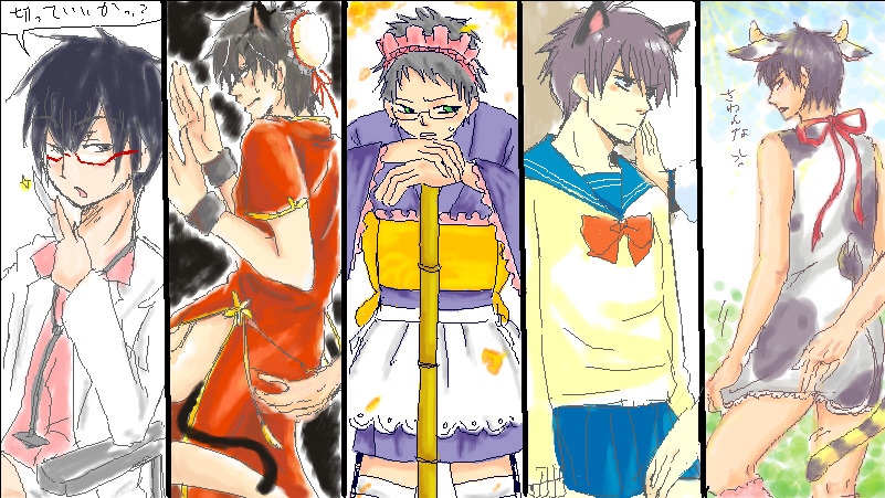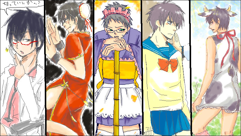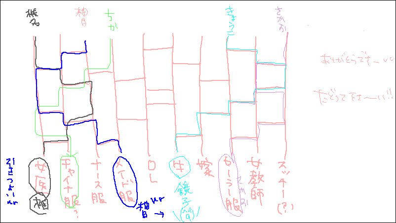 左から女医、チャイナ服、ナース服、メイド服、OL、牛、お嫁さん、セーラー服、女教師、スッチー